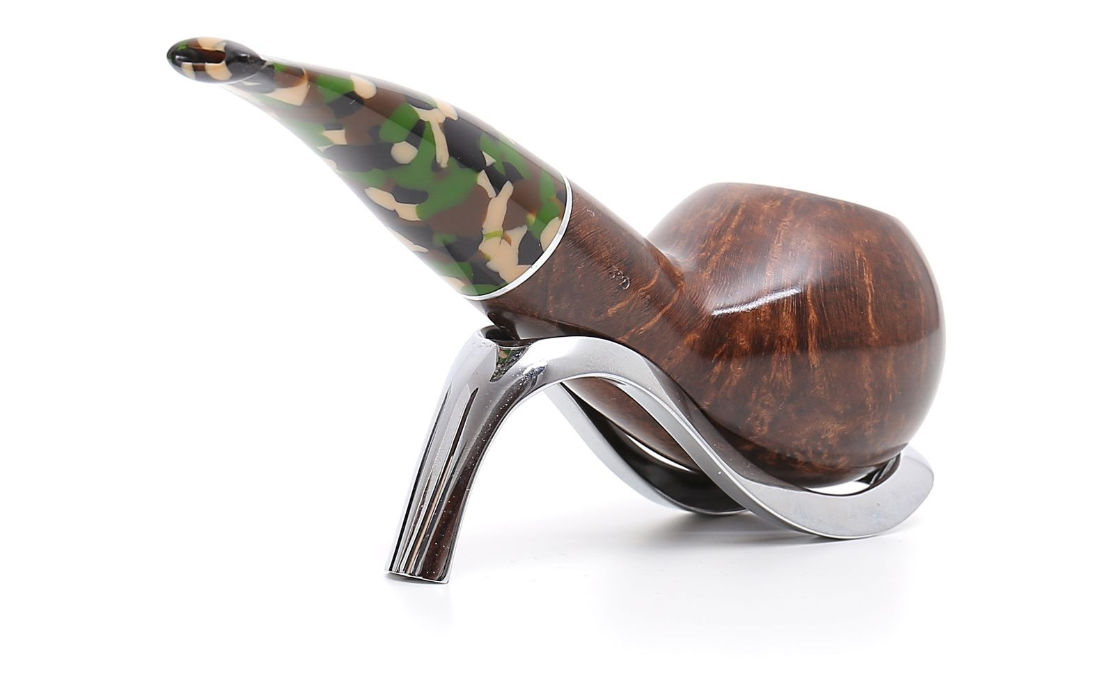 Die Camouflage-Serie ist in zwei Ausführungen, glatt braun und rustikal schwarz, und in 10 verschiedenen Modellen erhältlich. Der Acrylschaft ist in Tarnfarbe, die an Tarnstoffe erinnert. Zwischen dem Schaft und dem Stiel befindet sich ein dünner Aluminiumring, der die Pfeife beleuchtet. Das Modell 320, auch bekannt als Author shapes, hat einen unverwechselbaren Stil. Dieses halb gebogene Modell verfügt über eine der größten Schalen. Seine abgerundeten Formen und das Fehlen von Kanten machen den Griff äußerst angenehm.
