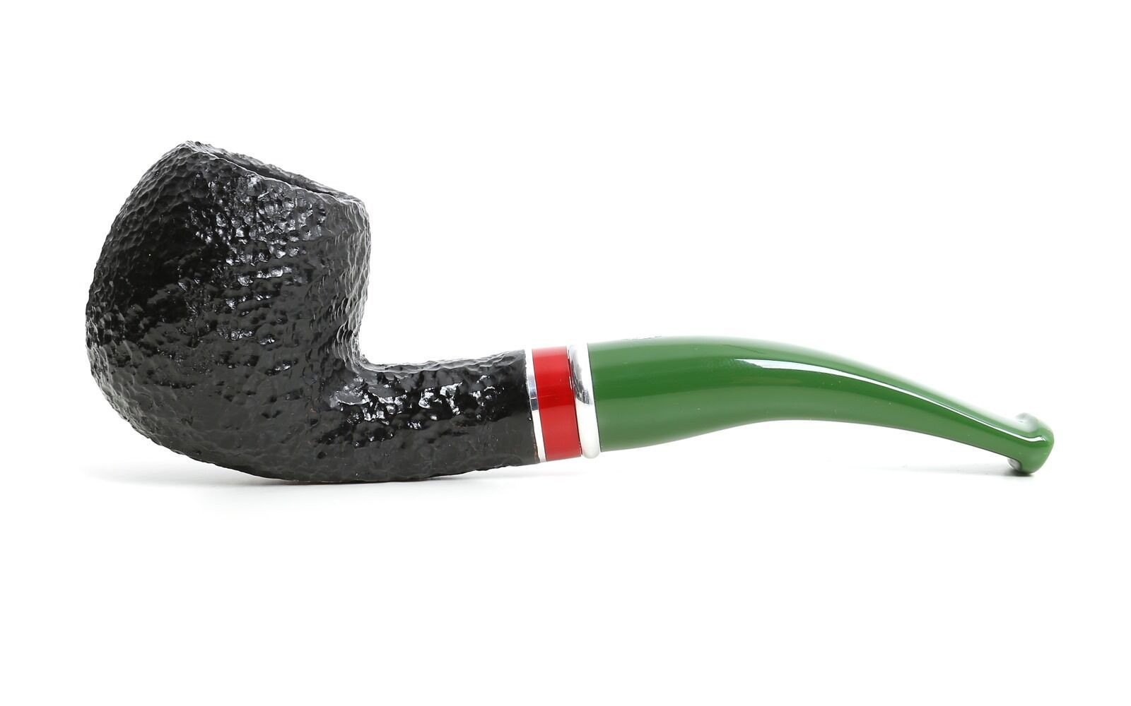 Das Design wird durch ein rotes Acrylband und einen dünneren Aluminiumring verziert. Das grüne Acrylmundstück mit einem silberfarbenen Ring passt perfekt zur Pfeife.