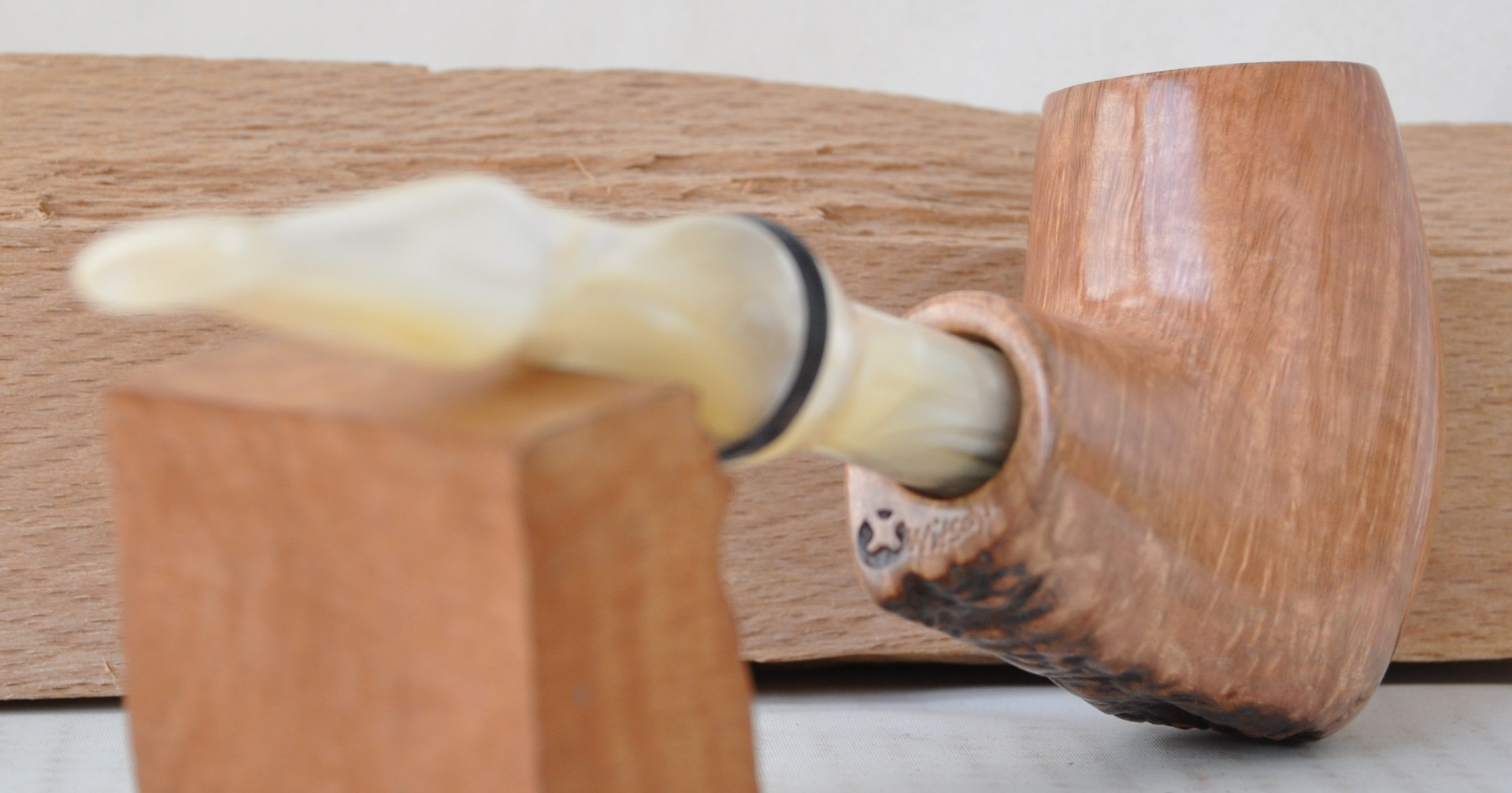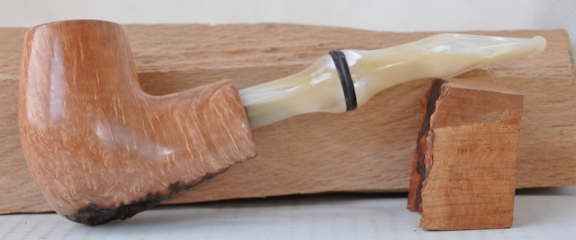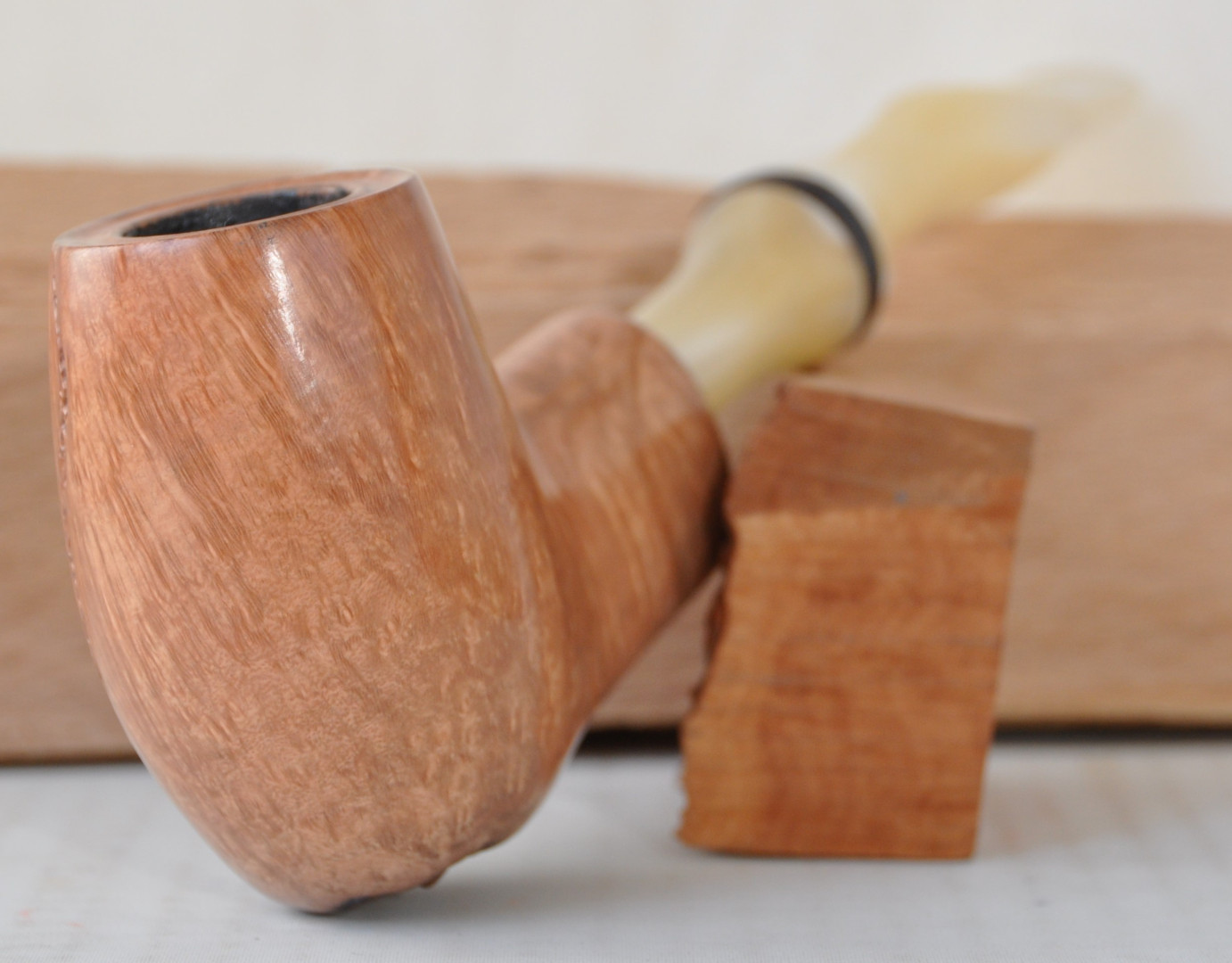 Pfeife aus Bruyère, ohne Filter, gerade. Mit Lederband am Mundstück.