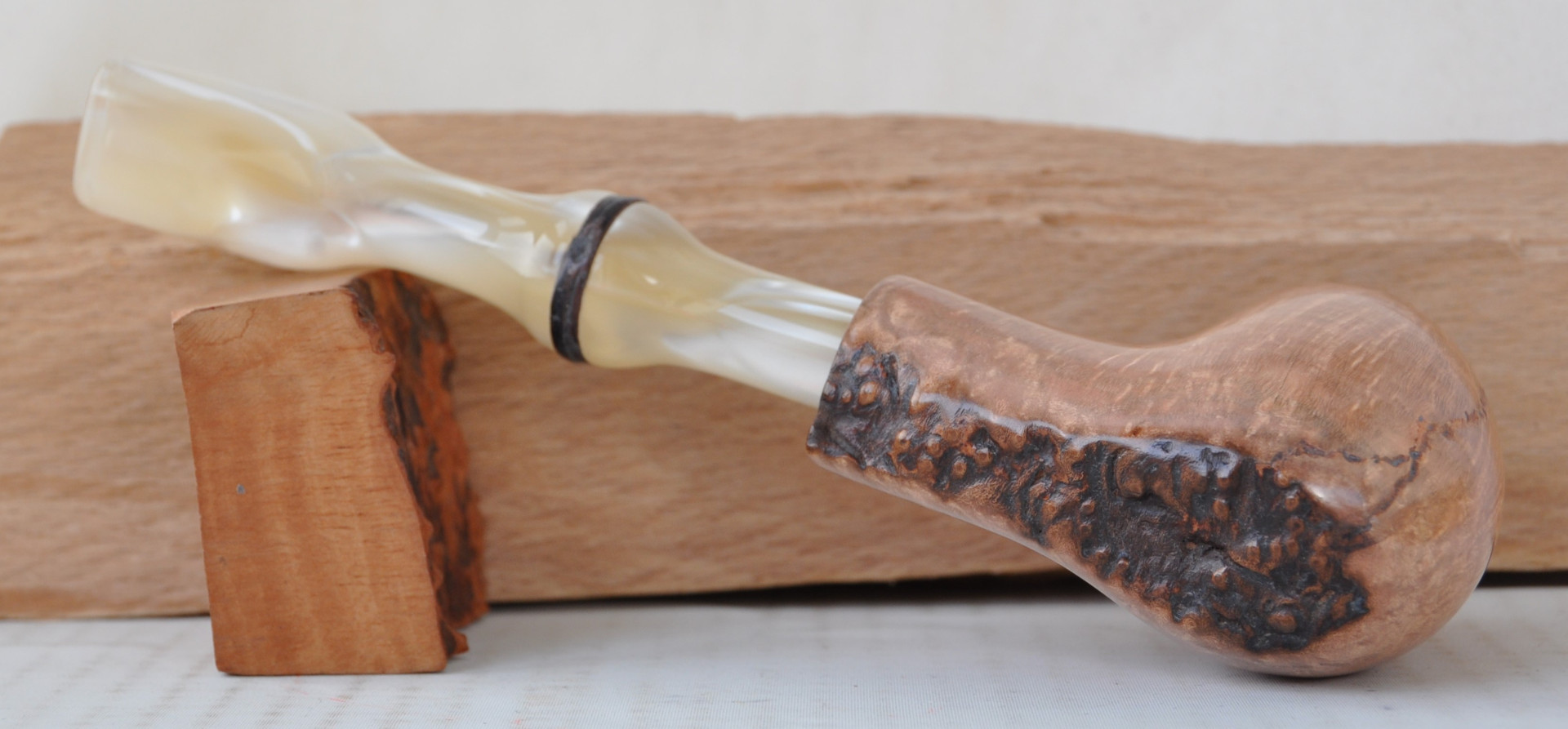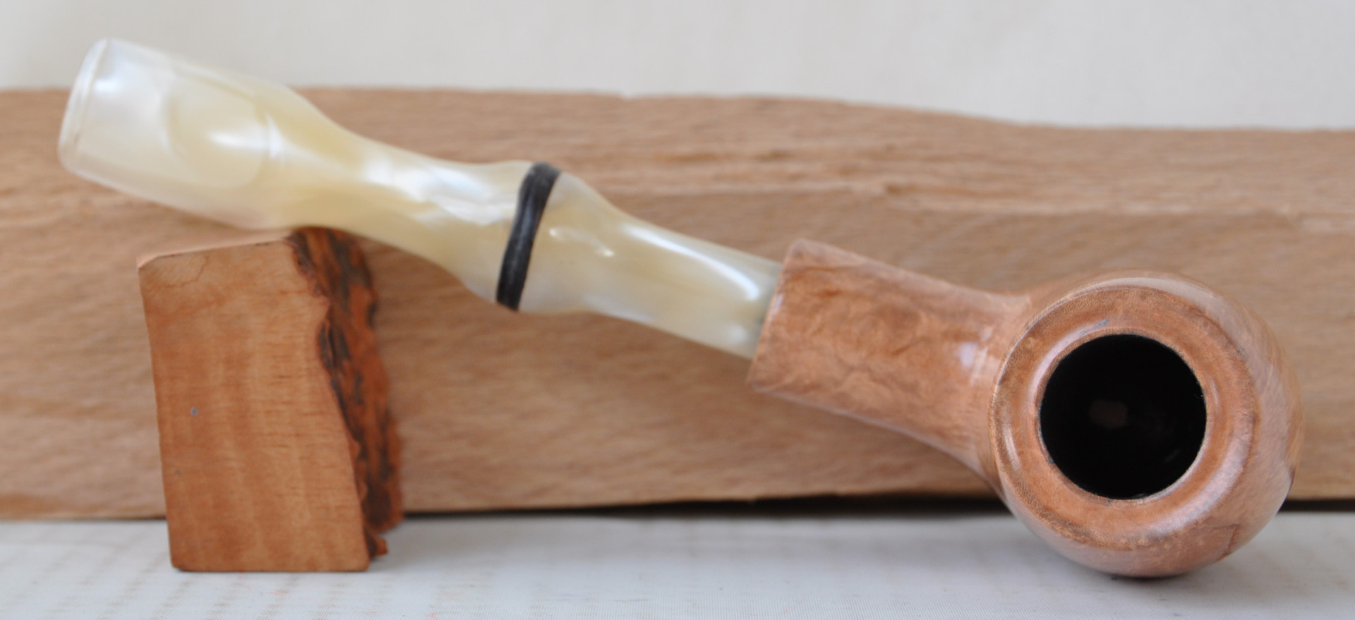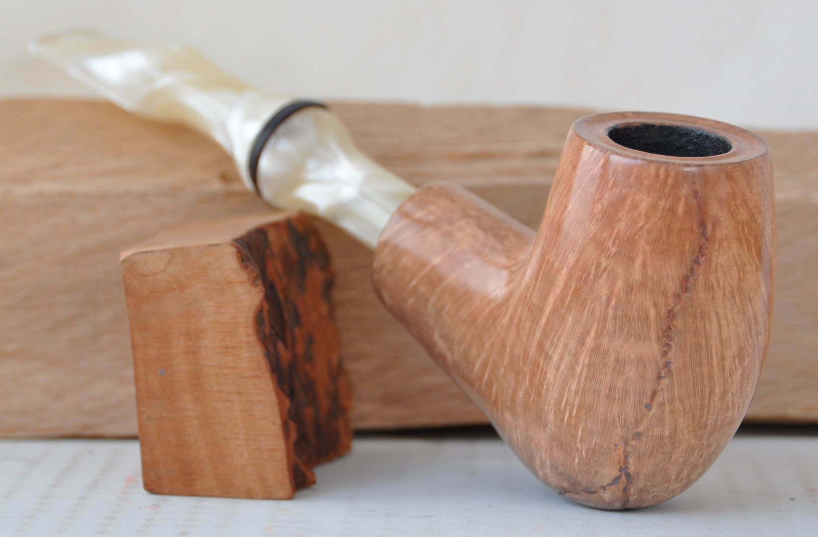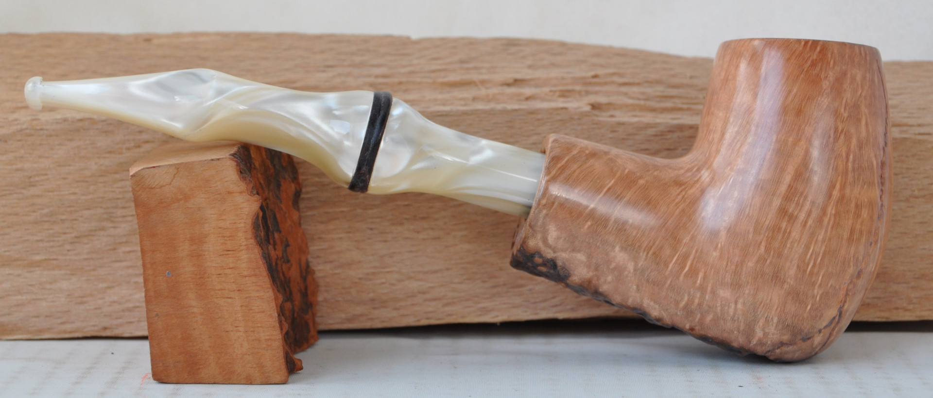 Pfeife aus Bruyère, ohne Filter, gerade. Mit Lederband am Mundstück.