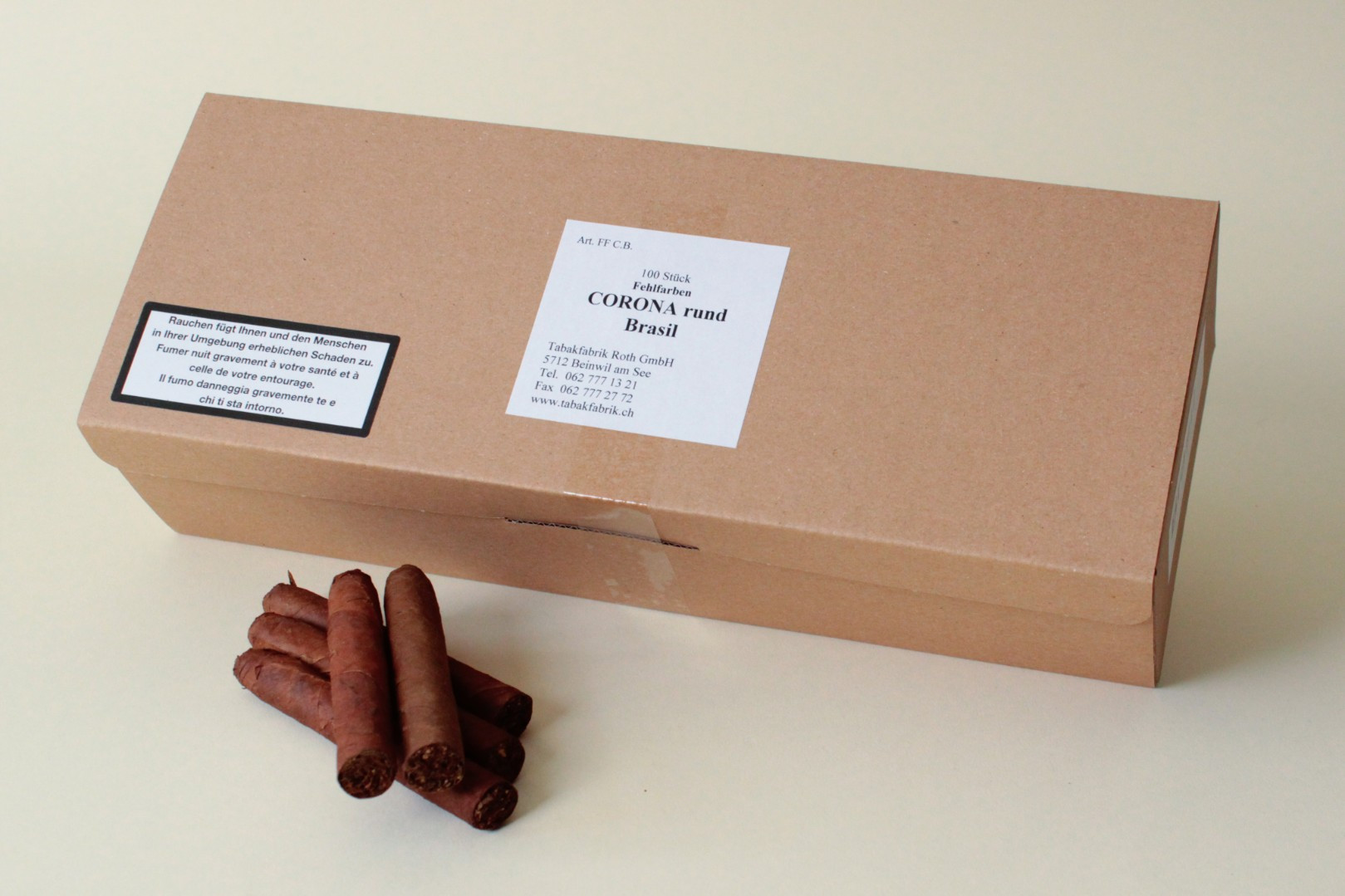Brasil Fehlfarben, ohne Cellophan, leicht konisch, mit dunklem Deckblatt.Masse: 107 x 15 mmKarton à 100 Stk
