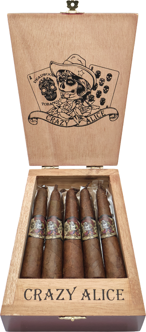 Etwas Verrückt – Die Crazy Alice besteht aus nicaraguanischen Einlagetabaken und einem köstlichen dunklem und öligem Maduro-Deckblatt. Die Deadwood Crazy Alice Zigarren sind mittelkräftig bis vollmundig mit köstlichen Noten von Schokolade, Trockenfrüchten, dunklem Röstkaffee und Erde. Probieren Sie etwas Neues und werden Sie ein wenig verrückt mit der Crazy Alice.