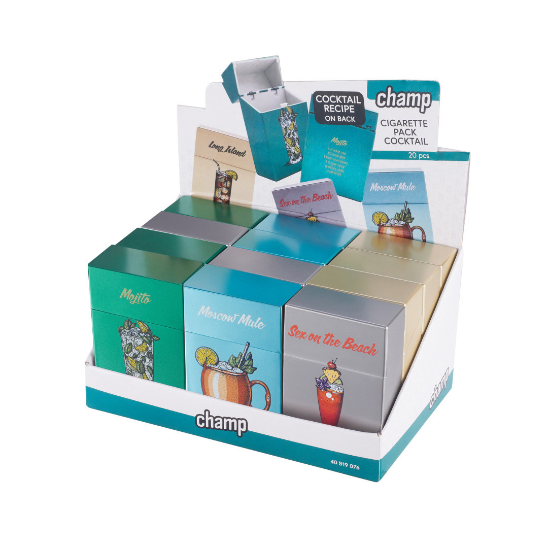 Zigarettenetuis im "Cocktail" Look, als Push-Box für 20 Zigaretten.Aus Kunststoff.Mit Rezept auf der Rückseite.