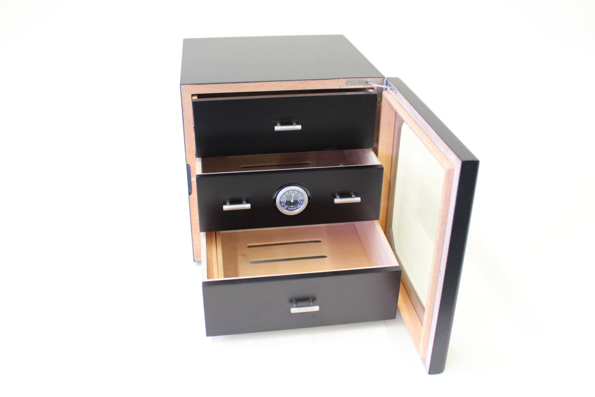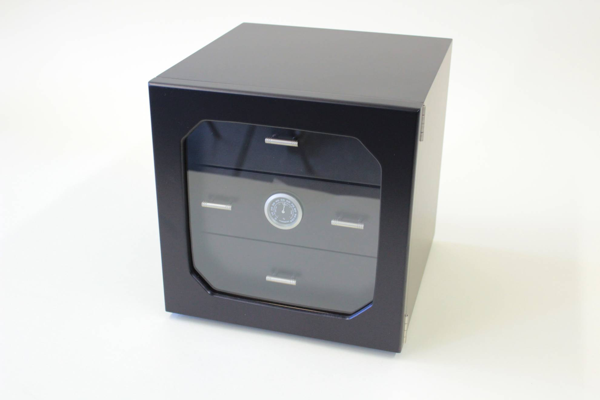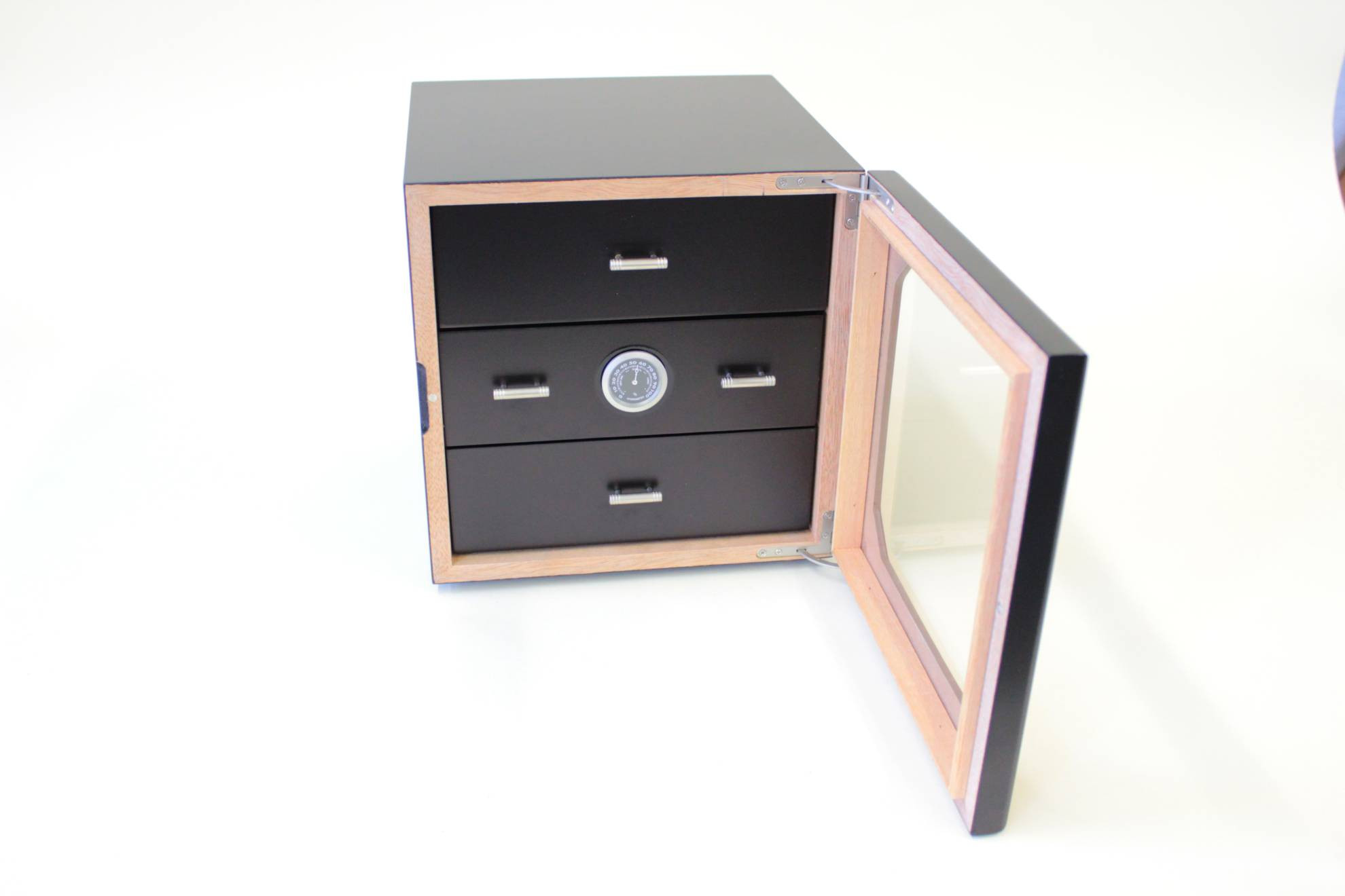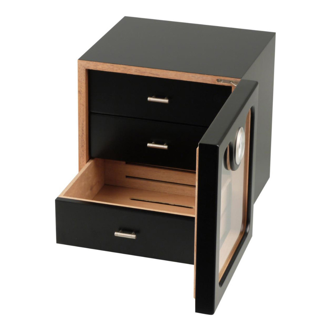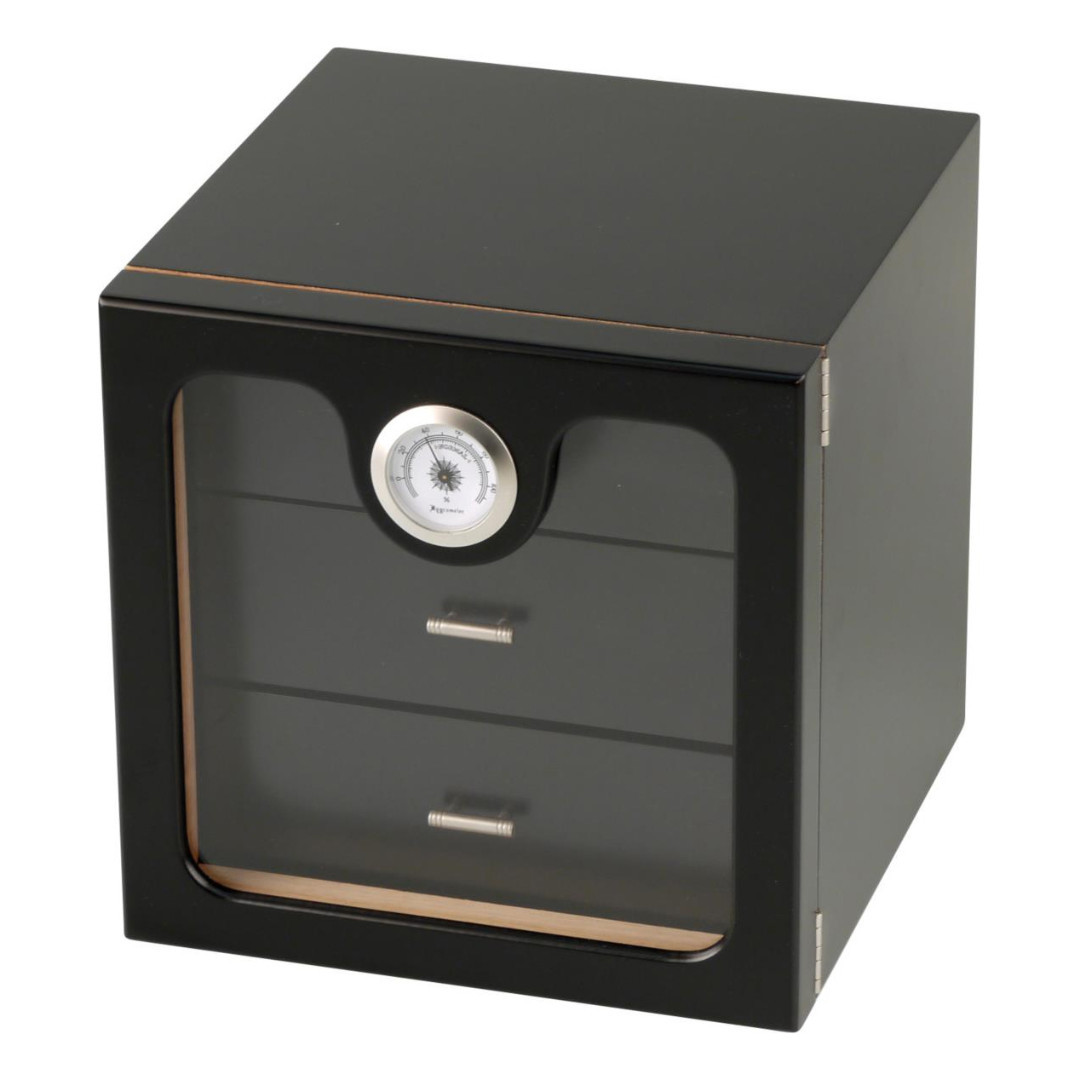 Schöner Humidor, schwarz, mit 3 Schubladen, Hygrometer und Klimasystem.