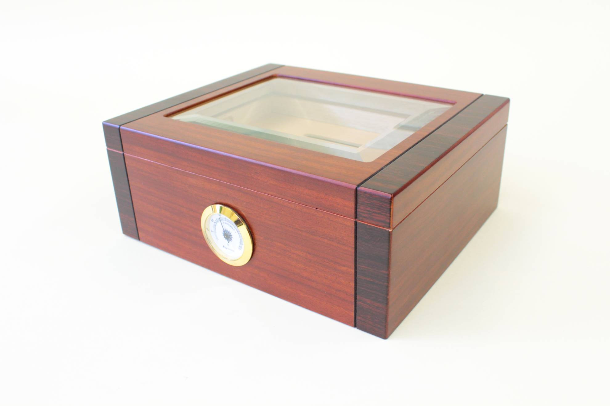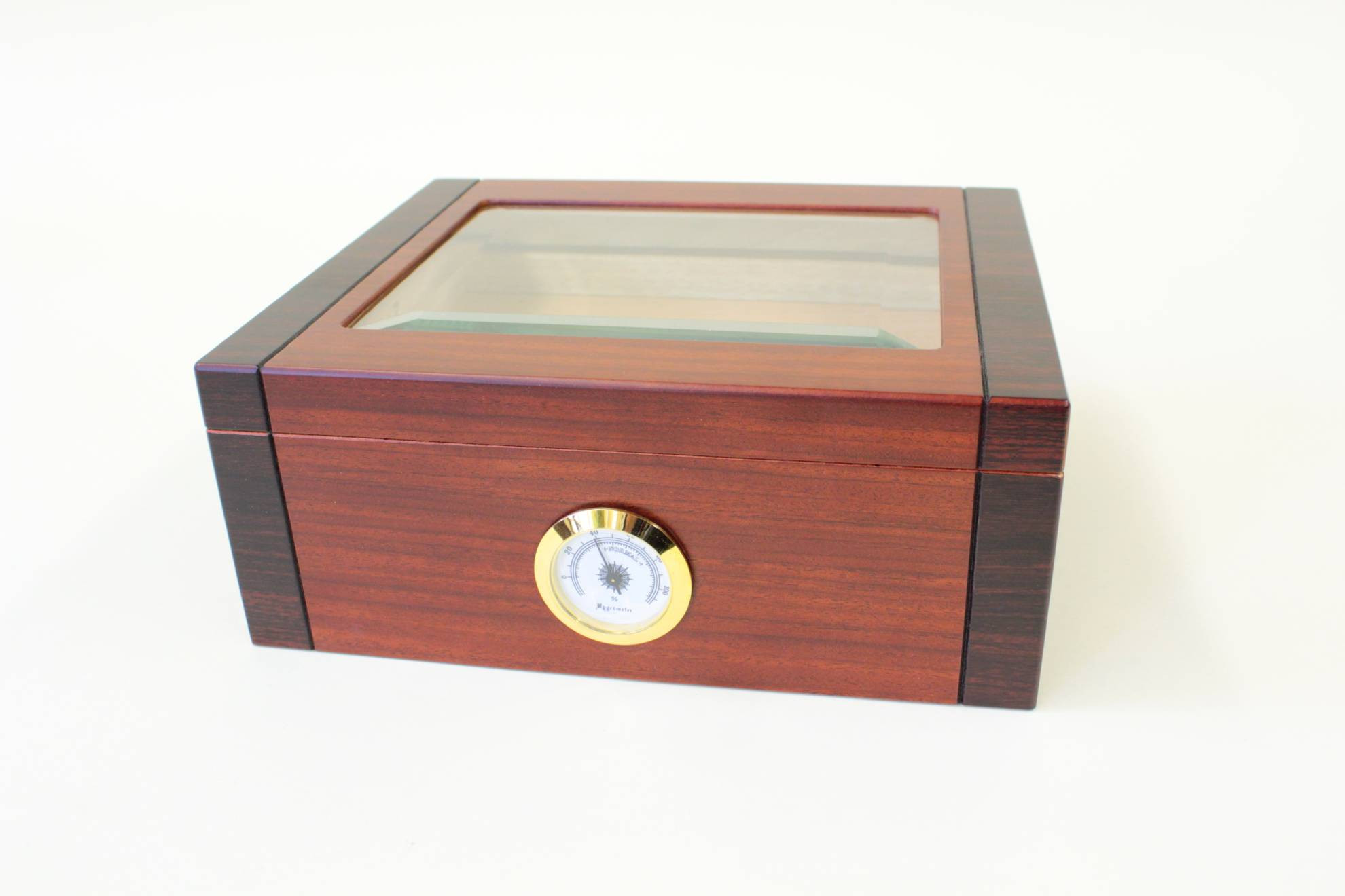 Humidor mit Glasdeckel, mit Hygrometer und Klimasystem, mit Raumteiler.